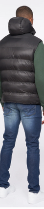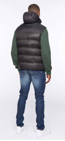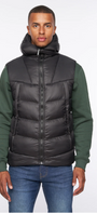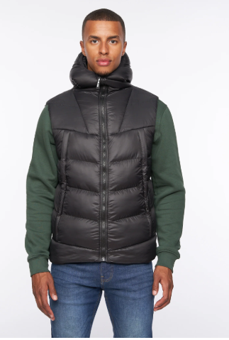 Men's hooded padded quilted zip thru gilet with contrast panel details with clear gel print. Branded zip puller and self fabric welt pocket with injected badge to sleeve.