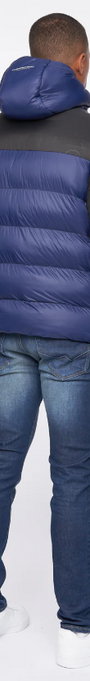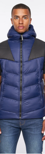 Men's hooded padded quilted zip thru gilet with contrast panel details with clear gel print. Branded zip puller and self fabric welt pocket with injected badge to sleeve.